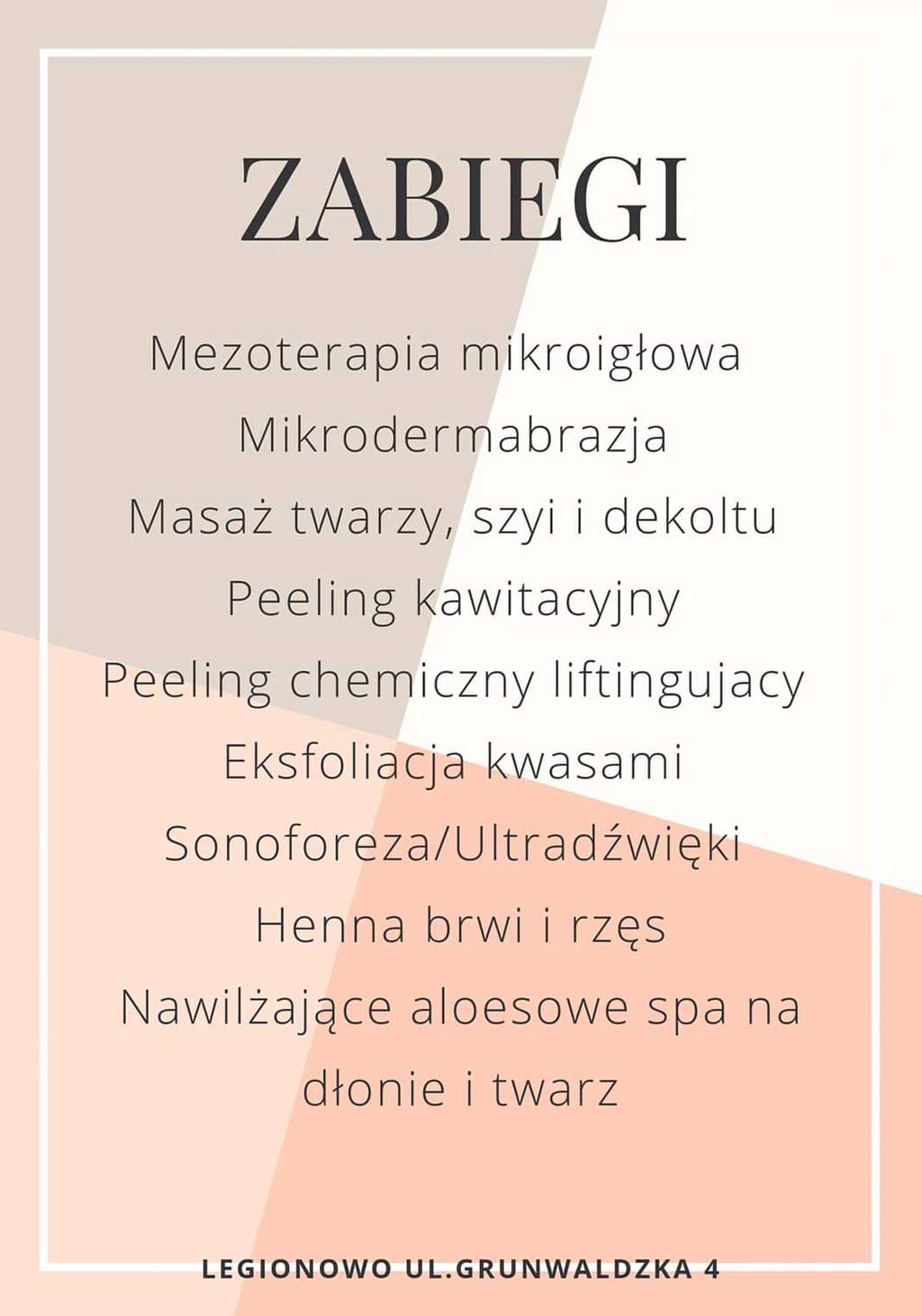 Zabiegi wzmacniające skóręTel: 501 664 539 Mezoterapia mikroigłowa Mikrodermabrazja Masaż twarzy, szyi i dekoltu Peeling kawitacyjny Peeling chemiczny liftingujący Eksfoliacja kwasami Sonoforeza/Ultradźwięki Henna brwi i rzęs Nawilżające aloesowe spa na dłonie i twarz Legionowo ul. Grunwaldzka 4 Tel: 501 664 539